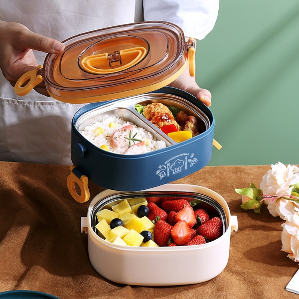 简约椭圆形双层不锈钢饭盒 大容量提手分格便当盒 祝贺礼品