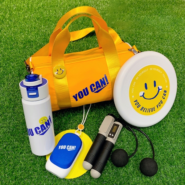快乐运动系列5件套 蓝牙音响+运动保温杯+飞盘+智能计数无线跳绳+运动包包+环保纸盒包装+贺卡+徽章