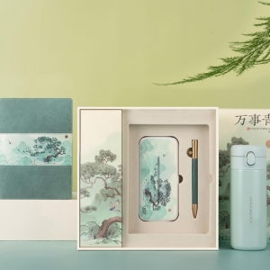 万事青松四件套礼盒 笔记本+黄铜笔+10000AH移动电源+乐扣乐扣保温杯套装 送给外国客户的促销礼品