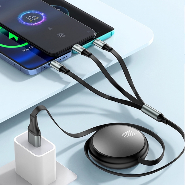 时尚100W三合二伸缩数据线 二拖三快充通用适用苹果Type-C手机车载充电线