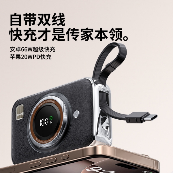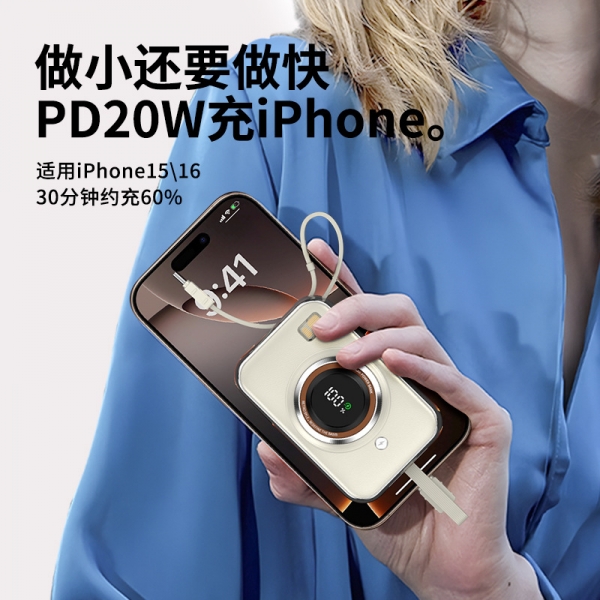您当前的位置:首页>智能数码>手机周边>移动电源>创意超迷你相机充电宝10000毫安 66W自带线快充充电宝轻薄数显移动电源