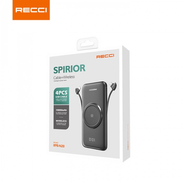 您当前的位置:首页>智能数码>手机周边>移动电源>RECCI锐思 铂睿系列自带线充电宝10000毫安 数显自带4条线无线充移动电源 商务礼品